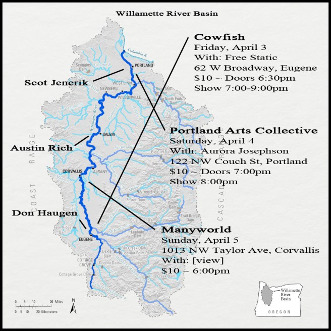 Mr. B of the “Stranger Than Fiction” radio show in Portland, Oregon, was kind enough to include some music by Don Haugen and Austin Rich, and talk up the “Willamette River Basin” Tour that is happening at the beginning of April. Above you’ll hear a 15 minute chunk of Mr. B’s show, where he plays some music by Austin & Don, and you can hear a few more moments from his show. You can find the complete two-hour program, which features a lot more music by other artists, either streaming from the Playlist (linked above), or from this link.